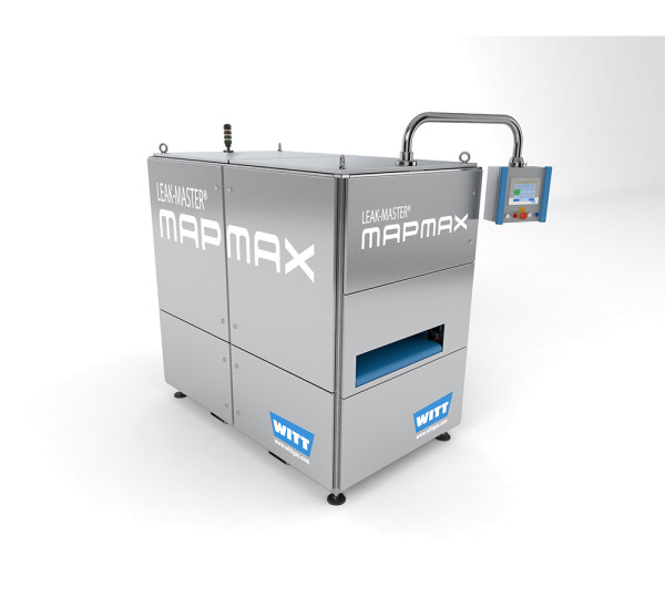 Inline-System zur Dichtheitsprüfung von Verpackungen auf CO2-Basis. Der LEAK-MASTER® MAPMAX ermöglicht zerstörungsfreies Aufspüren selbst kleinster Leckagen ohne den kostspieligen Einsatz von Helium als Spurengas – unmittelbar im Anschluss an den Verpackungsprozess.